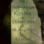 ![]() | Diether Adolph Kirsten #16 geb. 25. Mai 1921 gefallen 10. August 1942 (21 J.) | ![]() | Gedenkstein. Gefallen am Ilmensee in Russland Weiterer Gedenkstein auf dem Friedhof Lenzen/Nausen im Wendland | Ältester Sohn von Adolph P. und Karin Kirsten (#10/11), Bruder von Jan (#17) | |