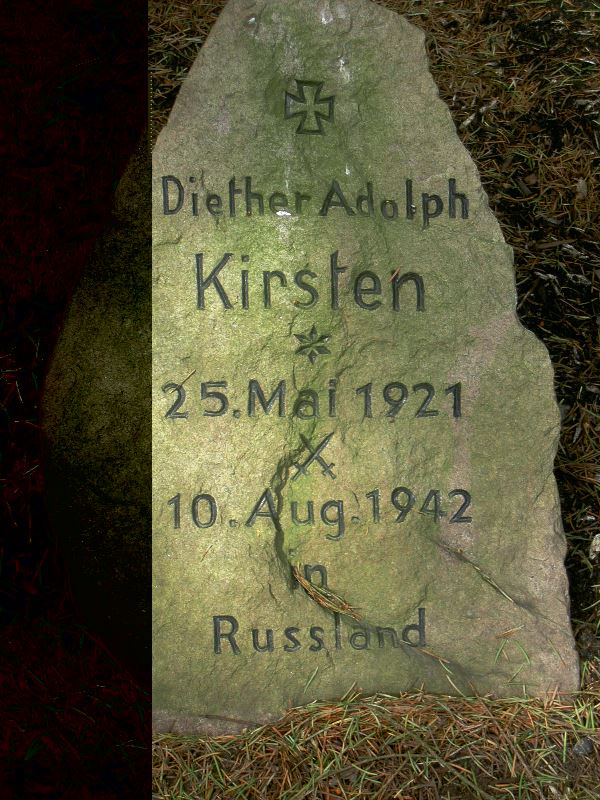 ![]() | Diether Adolph Kirsten #16 geb. 25. Mai 1921 gefallen 10. August 1942 (21 J.) | ![]() | Gedenkstein. Gefallen am Ilmensee in Russland Weiterer Gedenkstein auf dem Friedhof Lenzen/Nausen im Wendland | Ältester Sohn von Adolph P. und Karin Kirsten (#10/11), Bruder von Jan (#17) | |
