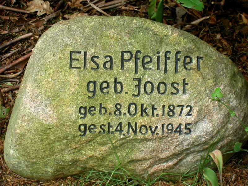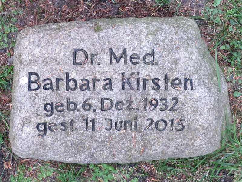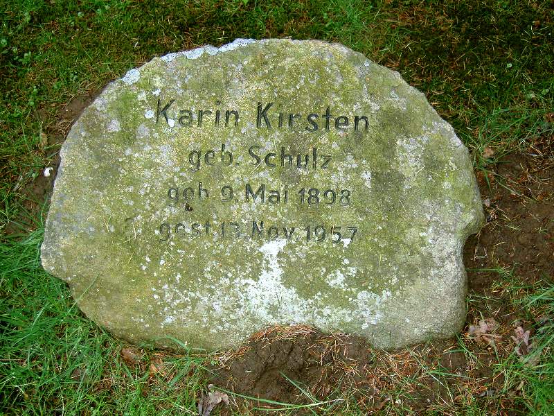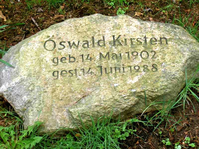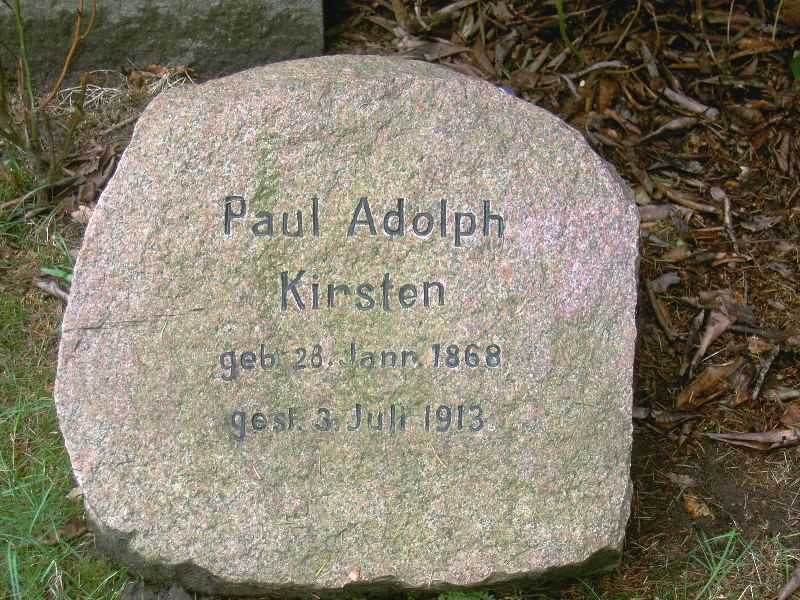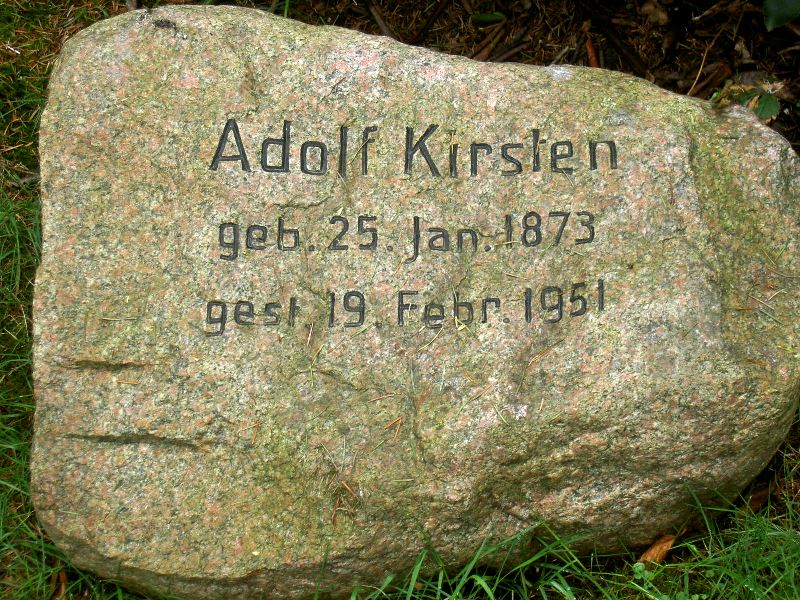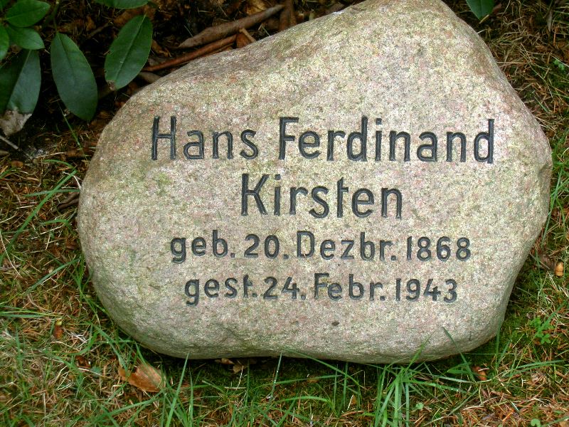 Robert Kirsten Webseite, GrablageS 23, ebenfalls Kapellenstrasse, Strassenseite wechseln, Zugang schräg gegenüber A. Kirsten Grab, dann links den Weg hinein (rechts zu Beginn Joost Grabstelle, siehe Elsa Kirsten/Pfeiffer geb. Joost), ca. Mitte des Weges rechte Seite, etwas zurückliegend (versteckt, je nach Bewuchs).