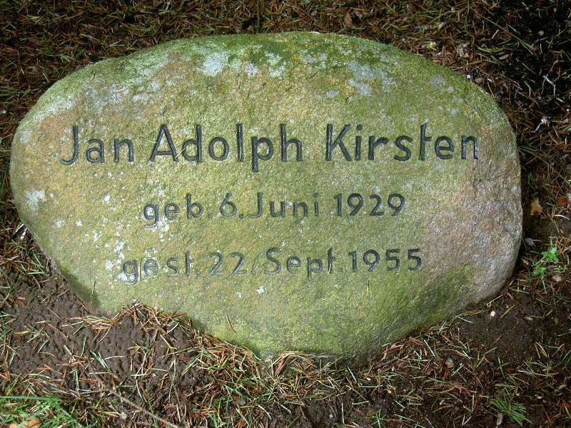 ![]() | Johan "Jan" Adolph Kirsten #17 geb. 6. Juni 1929 gest. 22. September 1955 (26 J.) | ![]() | Gestorben als Beifahrer bei einem Autounfall in Schleswig-Holstein | Jüngster Sohn von Adolph P. und Karin Kirsten (#10/11), Bruder von Diether (16) | |