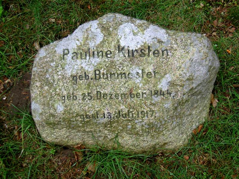 ![]() | Pauline Kirsten #2 genannt Pauline, geboren Rebecka Margarethe Karoline geb. Koch adopt. Burmester geb. 25. Dezember 1844 gest. 13. Juli 1917 (72 J.) | ![]() | 5 Kinder, 20 Enkelkinder Buch "Jugenderinnerungen" | Ehefrau von Adolph Kirsten (#1), Schwester von Susanne Burmester (#3) | |