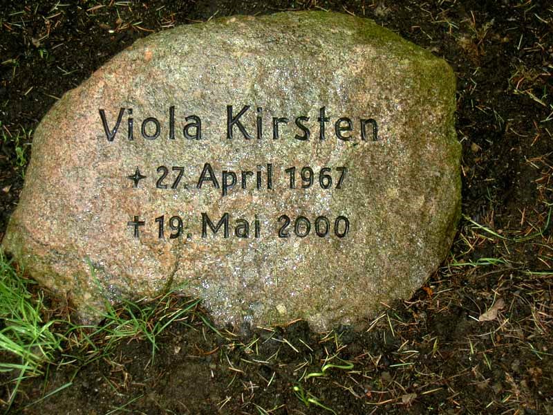![]() | Viola Europa Kirsten #23 geb. 27. April 1967 gest. 19. Mai 2000 (33 J.) | ![]() | Bürokauffrau | Enkeltochter von Adolph und Karin Kirsten (#10/#11) Tochter von Anja und Harald Kirsten | |