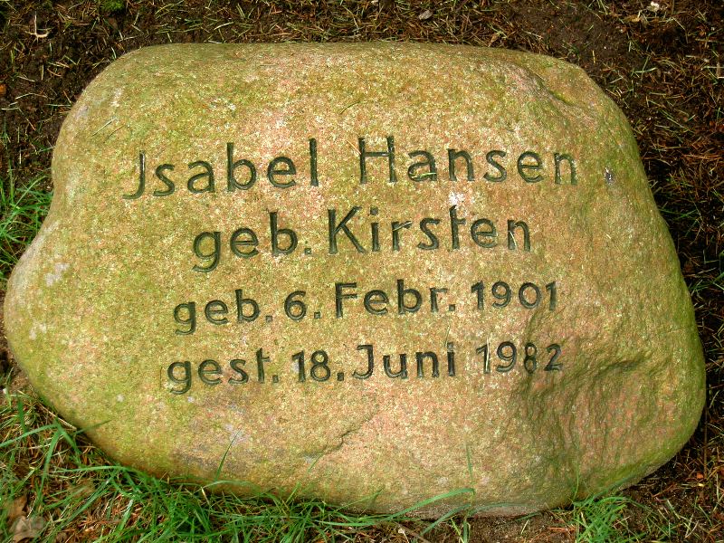 ![]() | Isabel Hansen #13 geb. Kirsten geb. 6. Februar 1901 gest. 18. Juni 1982 (81 J.) | Tochter von Adolf (#8), Schwester von Oswald (#14) | |||