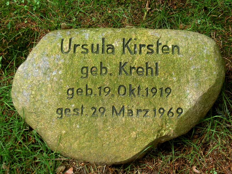 ![]() | Ursula Kirsten #12 verw. Kleiböhmer, geb. Krehl geb. 10. Oktober 1919 gest. 29. März 1969 (49 J.) | Zweite Ehefrau von Adolph Paul Kirsten (#10), Schwester von Karin (#18, nicht #11!), der 1. (von 3) Ehefrau von Harald | |||